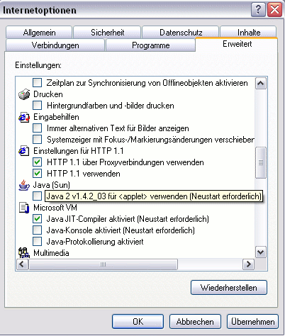 In der Regel hilft es, einfach eine andere Java-Version zu installieren, oder im Browser die Verwendung der externen Java-Version zu deaktivieren; im Microsoft Internet Explorer klicken Sie dazu auf Extras-Optionen, danach auf Erweitert und deaktivieren das Häckchen unter Java (siehe auch Bild).